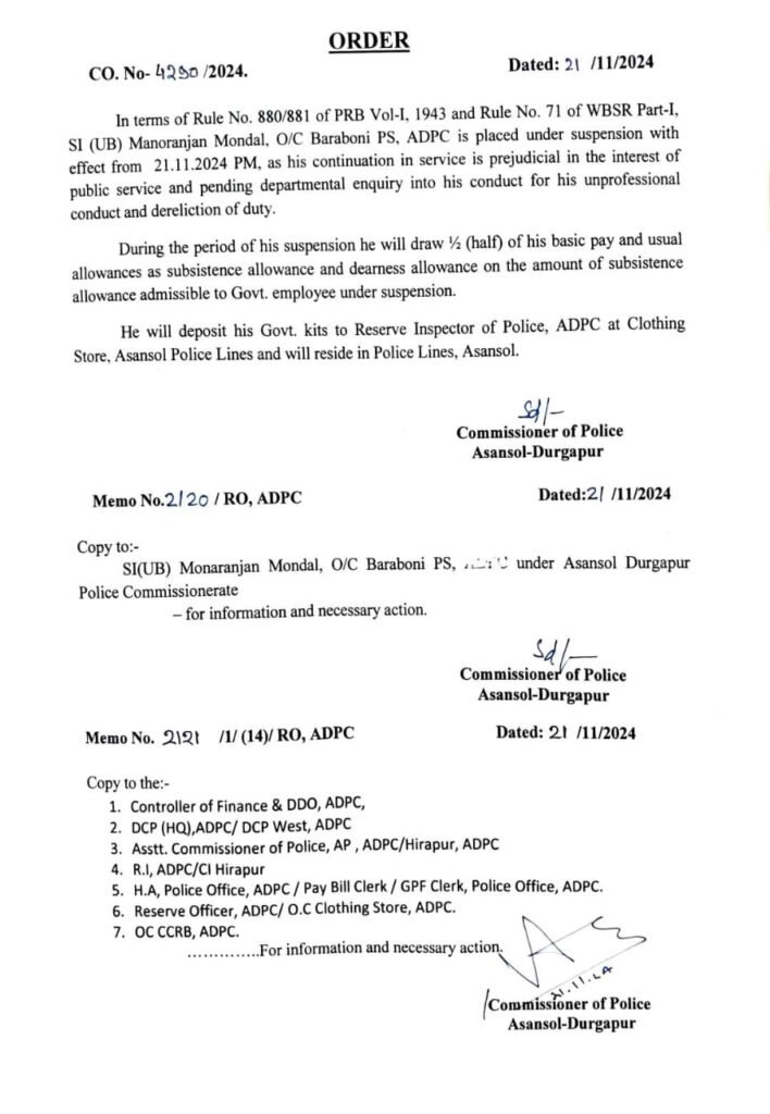 নির্ভীক বাংলা কৌশিক মুখার্জি আসানসোল:- সাসপেন্ড করা হল আসানসোলের বারাবনি থানার প্রাক্তন ও.সি এস আই মনোরঞ্জন মন্ডলকে। মাত্র কয়েকদিন আগেই বারাবনি থানা থেকে ট্রান্সফার করে অন্ডাল থানাতে পোস্টিং দেওয়া হয়েছিল।কিন্তু অন্ডাল থানায় পৌঁছাতে না পৌঁছাতেই সাসপেন্ড এর অর্ডার বের হয়ে যায়। সরকারি এক নির্দেশিকায় তার সাসপেন্ড এর তারিখ দেওয়া হয়েছে 21.11.24 । এবং তাকে পুলিশ […]
