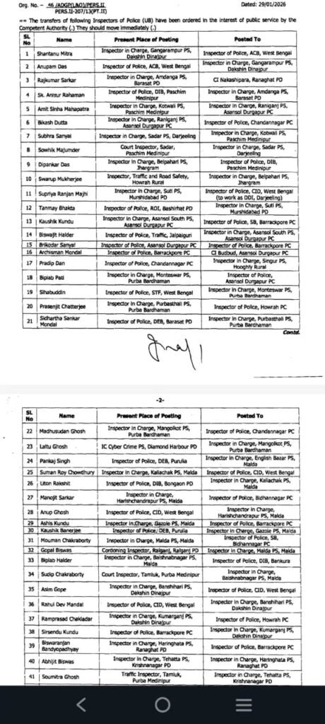 WBP: ১০৯ জন ইন্সপেক্টর স্তরের আধিকারিকের রদবদল