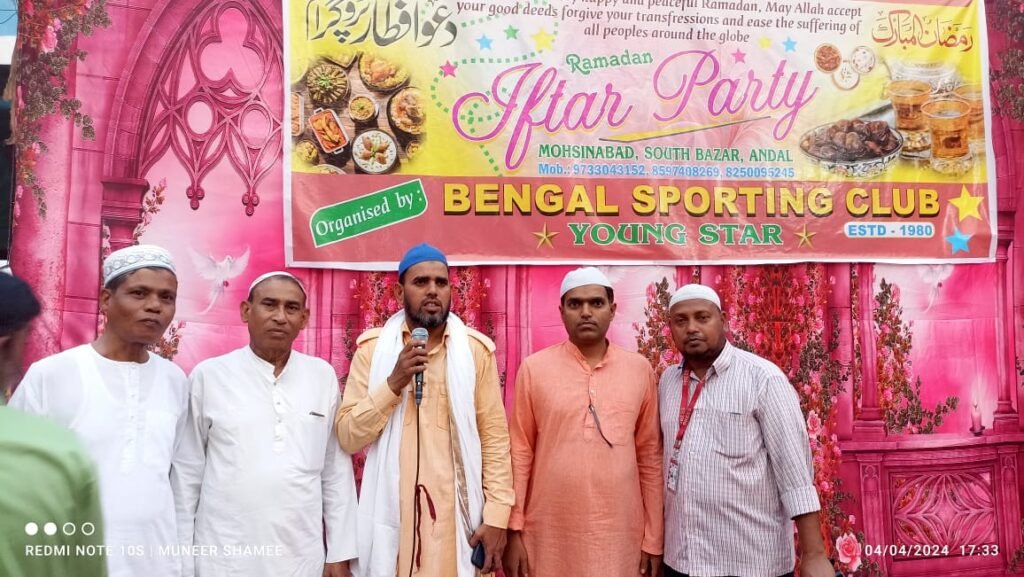 নির্ভীক বাংলা 4 এপ্রিল 2024: অন্ডাল দক্ষিণ বাজারে অবস্থিত বেঙ্গল স্পোর্টিং ক্লাবের আহ্বায়ক ও সেক্রেটারি – মোস্তফা খান, হাতেম ও ইমরান এবং সকল সদস্যদের সফল প্রচেষ্টায় আজ ইফতার পার্টির সফল আয়োজন করা হয়। এসময় অন্ডালের সকল সম্মানিত ও বিশিষ্ট ব্যক্তিবর্গ উপস্থিত ছিলেন। প্রতি বছরের ন্যায় এ বছরও ইফতারের সকল উপকরন ও সুস্বাদু আইটেম পরিবেশন করা […]