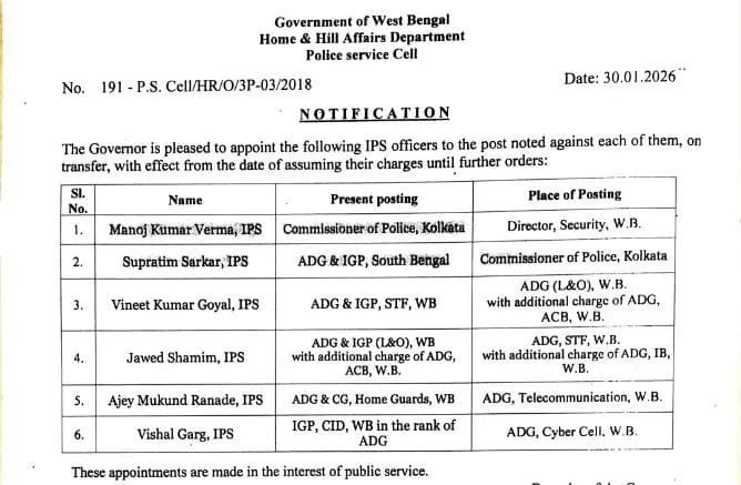 নির্ভীক বাংলা,: রাজ্য সরকার পুলিশ প্রশাসনে বড়সড় রদবদল করে সিনিয়র আইপিএস আধিকারিক পীযূষ পাণ্ডেকে রাজ্য পুলিশের কার্যনির্বাহী ডিরেক্টর জেনারেল অব পুলিশ (ডিজিপি) হিসেবে নিয়োগ করল। এই প্রশাসনিক রদবদলের আওতায় মোট ২৩ জন আইপিএস আধিকারিকের বদলি ও নতুন দায়িত্ব ঘোষণা করা হয়েছে। সরকারি নির্দেশিকা অনুযায়ী, বর্তমান প্রশাসনিক পরিস্থিতি ও আইনশৃঙ্খলার বিষয়টি বিবেচনায় রেখে তাৎক্ষণিকভাবে পীযূষ পাণ্ডেকে […]