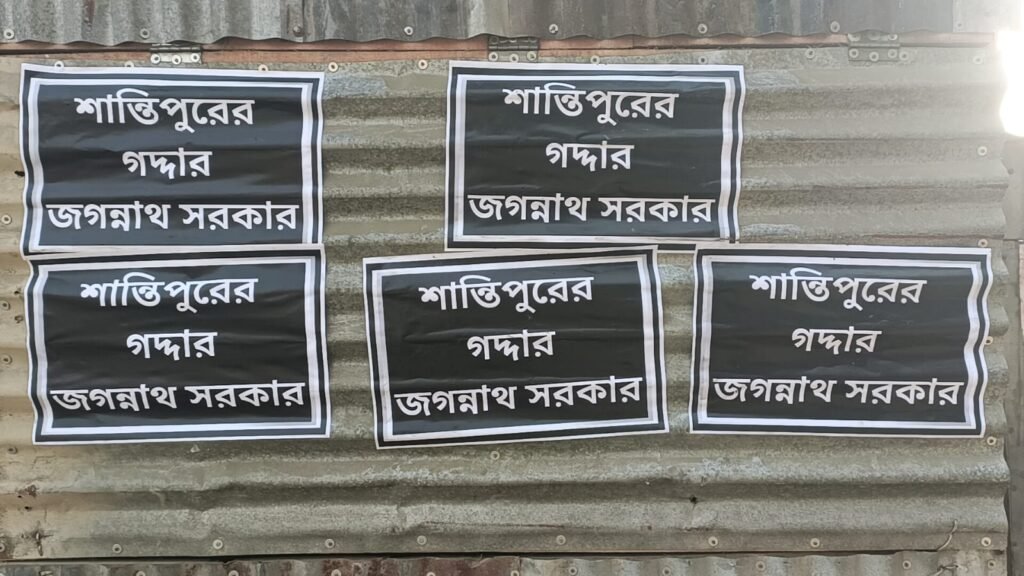 নির্ভীক বাংলা,শান্তিপুর: কেন্দ্রীয় বস্ত্রমন্ত্রী গিরিরাজ সিং-এর শান্তিপুর সফরের ঠিক আগেই গোটা শান্তিপুর জুড়ে বিজেপি সাংসদ জগন্নাথ সরকারের নামে পোস্টার পড়াকে কেন্দ্র করে তীব্র রাজনৈতিক উত্তেজনা ছড়াল। পোস্টারগুলিতে লেখা রয়েছে— “শান্তিপুরের গাদ্দার জগন্নাথ সরকার”। উল্লেখ্য, কিছুক্ষণের মধ্যেই শান্তিপুরে পৌঁছনোর কথা কেন্দ্রীয় বস্ত্রমন্ত্রী গিরিরাজ সিং-এর। সেখানে তিনি তাঁত শিল্পীদের সঙ্গে বৈঠক করবেন। ওই কর্মসূচিতে উপস্থিত থাকার কথা […]