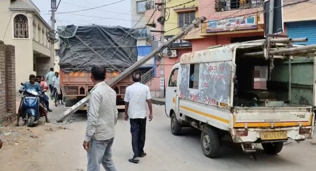 নিয়ামতপুরে চাল বোঝাই লরির ধাক্কায় বিদ্যুৎ খুঁটি ভেঙে পড়ল, এলাকায় সাময়িক বিদ্যুৎ বিভ্রাট