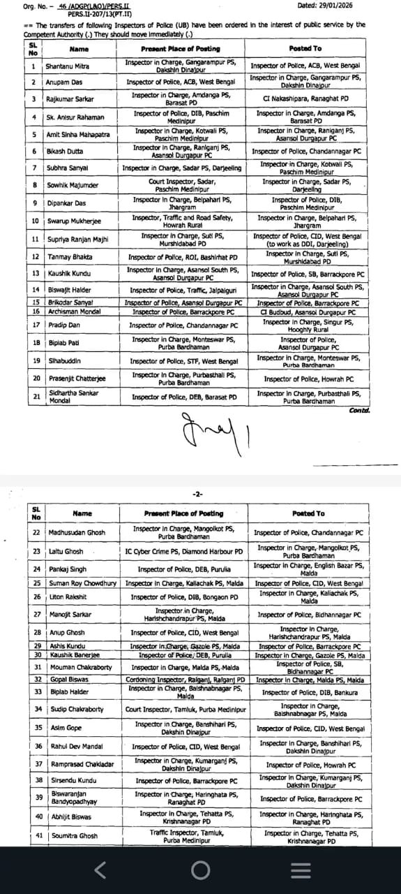 পশ্চিমবঙ্গ পুলিশে ইন্সপেক্টর স্তরের মোট ১০৯ জন আধিকারিকের বদলি করা হয়েছে। বিধানসভা নির্বাচনের আগে এই রদবদলকে প্রশাসনিকভাবে গুরুত্বপূর্ণ বলে মনে করা হচ্ছে।