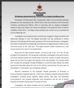 নির্ভীক বাংলা, শ্যাম দাস, আসানসোল,১৪ ফেব্রুয়ারি, ২০২৬: অবৈধ কয়লা খনন ও চুরির সঙ্গে যুক্ত অর্থ পাচার মামলায় বড়সড় পদক্ষেপ নিল Enforcement Directorate (ইডি)। ২০০২ সালের মানি লন্ডারিং প্রতিরোধ আইন (পিএমএলএ) অনুযায়ী ১০০.৪৪ কোটি টাকার সম্পদ অস্থায়ীভাবে বাজেয়াপ্ত করা হয়েছে।